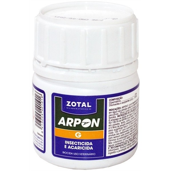 ARPON G é um inseticida líquido impulsionável em água, cujo princípio ativo é Cipermetrina. Este princípio caracteriza-se pela sua alta eficácia e amplo espectro de ação, contra praticamente todos os tipos de insetos e ácaros: eliminação de moscas, mosquitos, pulgas, piolhos, carraças, vespas, baratas, ácaros vermelhos e outros insetos.