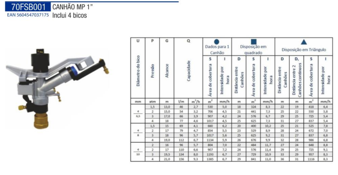 Modelo: 70FSB001 – inclui 4 bicos de diferentes débitos e alcance que podem ser substituídos conforme a necessidade.